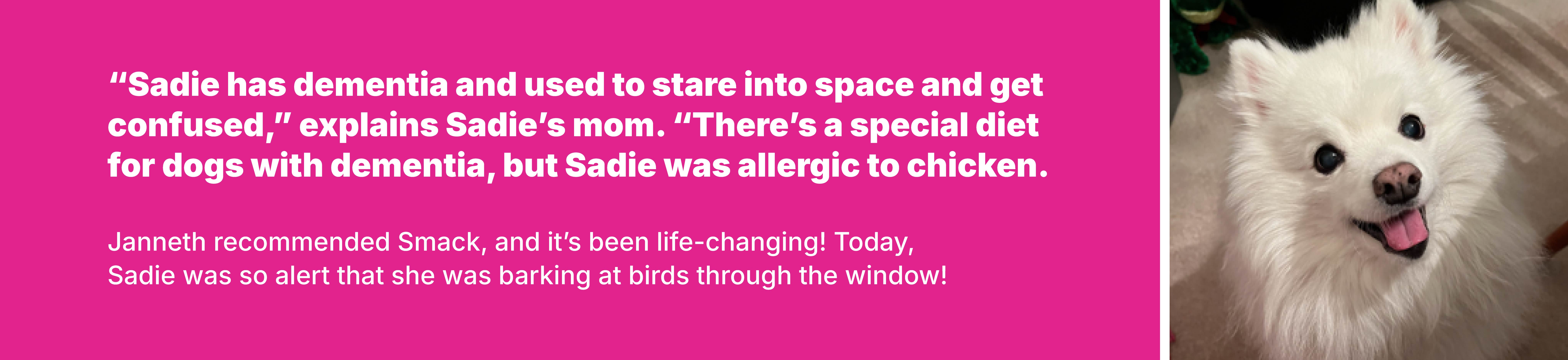 Janneth isn’t the only one at Bone & Biscuit Co., Calgary Legacy Corner, who thinks so. One of their customers was looking for natural solutions that could help her dog, Sadie, who was in the early stages of dementia. “Sadie has dementia and used to stare into space and get confused,” explains Sadie’s mom. “There’s a special diet for dogs with dementia, but Sadie was allergic to chicken. Janneth recommended Smack, and it’s been life-changing! Today, Sadie was so alert that she was barking at birds through the window!”